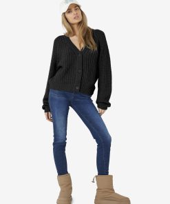 – Knitted cardigan – Button fastenings through front – V-neck – Long sleeved – Ribbed neckline, hem and cuffs- Relaxed fit